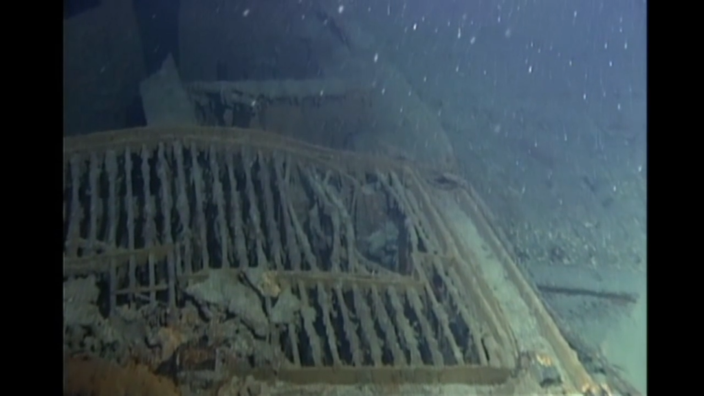 But what happened next? Titanic’s funnels, along with her masts and rigging, were among the items that originally concerned the team lead by Robert Ballard and Jean-Louis Michel when they decided to use the towed sled Argo to film the wreck once it was discovered in 1985. If Argo had been too close to the decks, it might collide with the ship’s funnels or get stuck in the rigging. Fortunately for the explorers, the funnels were nowhere to be found and the ship’s masts had both collapsed.